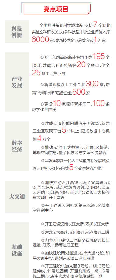 緊扣“實(shí)力雄厚”,大力推動(dòng)高質(zhì)量發(fā)展:做大做強(qiáng)區(qū)級(jí)經(jīng)濟(jì),著力提升“一主引領(lǐng)”輻射力,帶動(dòng)武漢城市圈同城化發(fā)展,打造全國重要增長極。初步建成國家商貿(mào)物流中心、區(qū)域金融中心,加快打造長江流域和中部地區(qū)樞紐港、鐵路客貨運(yùn)“雙樞紐”、航空客貨運(yùn)門戶“雙樞紐”,發(fā)揮自貿(mào)區(qū)帶動(dòng)作用,全面提速國際交往中心建設(shè)。